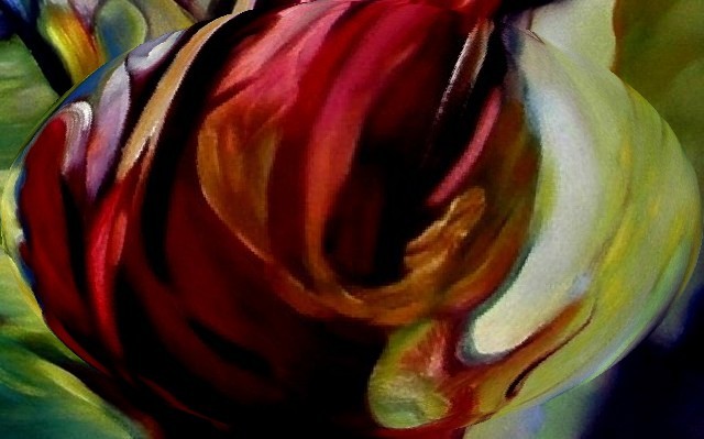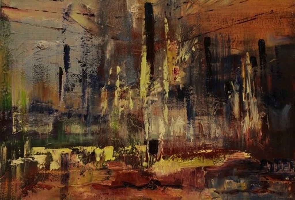 Een abstract werk geïnspireerd door het schilderij 'Avondrood'. Vormen en kleuren vloeien samen tot een innerlijke beweging, waarin de gloed van het avondlicht opnieuw tot leven komt — als een visuele herinnering aan het moment tussen dag en nacht.