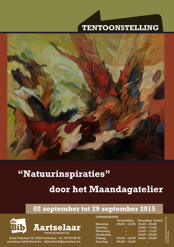 Groepstentoonstelling van het Maandagatelier Bibliotheek Aartselaar, della Faillelaan 32, Aartselaar van 2 september 2015 tot en met 31 november 2015