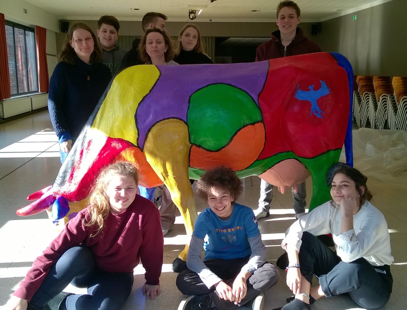Tijdelijke installaties thema ' De Koe ' van het Maandagatelier fleuren de voortuin van het Cultureel centrum van Aartselaar van 27 april t.e.m. 13 mei 2018.
