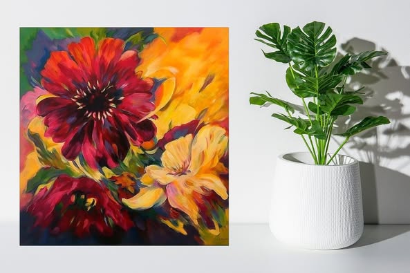 Een zinderend stilleven van een Colombiaanse blauwe bananenboom, waarin kleur en beweging samenvloeien tot een tropisch ritme. De expressieve bladeren en vurige bloemen vangen de energie van een landschap dat leeft en ademt.